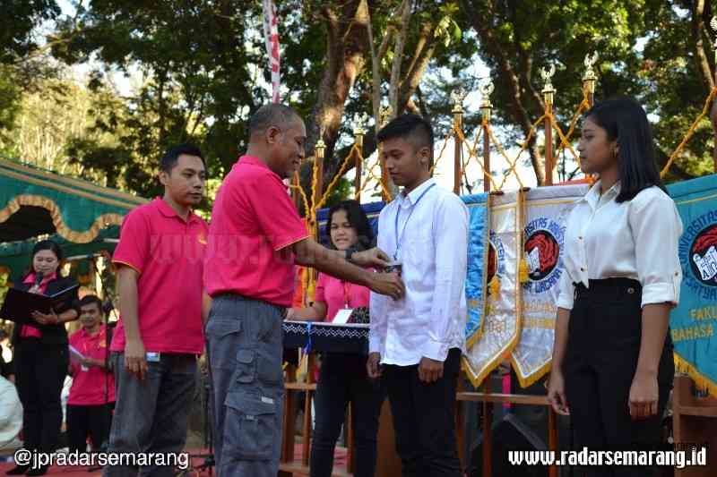 RADARSEMARANG.COM, SALATIGA – Parade mahasiswa dengan didahului bendera / pataka tiap fakultas memasuki lapangan sepakbola Universitas Kristen Satya Wacana (UKSW), Senin (19/8) membuka gelaran Pembukaan Orientasi Mahasiswa Baru (OMB) 2019. Kegiatan pengenalan lingkungan kampus ini dibuka secara resmi dengan penyematan tanda peserta kepada dua mahasiswa baru (maba) yakni Yayuk Kurniati Oruwo mahasiswi Fakultas Hukum asal Poso serta Alpha Fausta Ikrar Setyadi mahasiswa Fakultas Teknologi Informasi asal Salatiga. Lalu dilanjutkan pemukulan gong oleh Pembantu Rektor III UKSW, Dr. Andeka Rocky Tanaamah, S.E., M.Cs., didampingi ketua panitia OMB 2019, Michael Bezaleel Wenas, S.Kom., M.Cs.