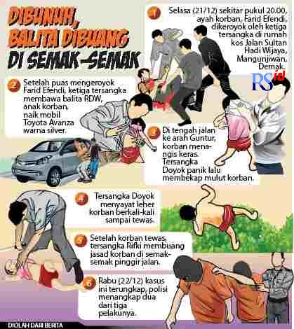 Pembunuhan balita ini merupakan buntut aksi pengeroyokan yang dialami ayah korban RDW, yakni Farid Efendi, 42, warga Desa Karanganyar, Kecamatan Sungai Kunjang, Kota Samarinda, Kalimantan Timur, yang kos di Jalan Sultan Hadi Wijaya Mangunjiwan, Kabupaten Demak.