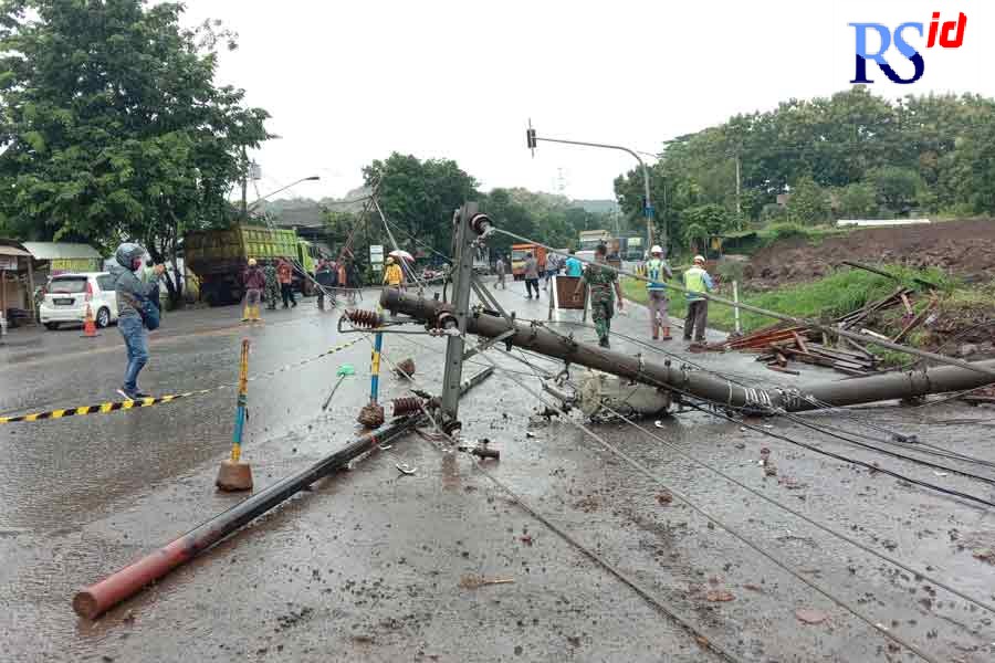 RADARSEMARANG.COM, Batang – Tiang listrik di Jalan Pantura Desa Plelen, Kecamatan Gringsing roboh, Kamis (13/1/2022). Akibatnya, kabel listrik melintang di tengah jalan. Peristiwa itu terjadi sekitar pukul 13.00 WIB dan mengakibatkan arus lalu lintas tersendat.