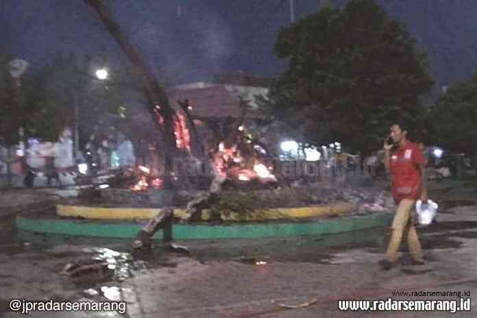 RADARSEMARANG.COM, DEMAK – Sebuah pohon beringin yang tumbuh dipojok Alun-Alun Kota Demak, tepatnya didepan Masjid Agung Rabu (14/8) petang sekitar pukul 17.15 terbakar. Api berhembus kencang sehingga sulit dipadamkan. Mobil pemadan dikerahkan untuk menjinakkan api yang membubung tinggi ke udara.