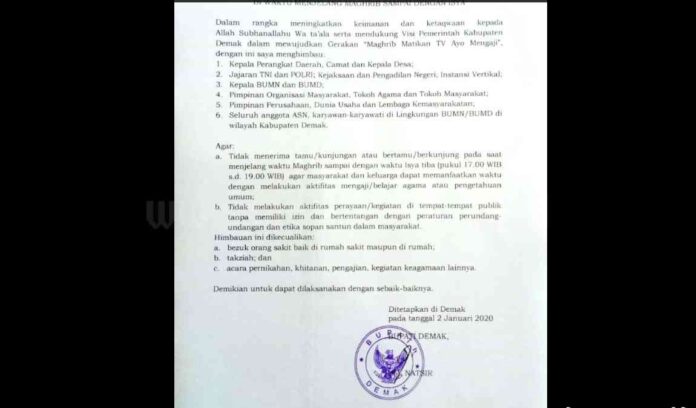 RADARSEMARANG.COM DEMAK – Larangan bertamu saat Maghrib hingga Isya menuai pro kontra dimasyarakat. Bahkan, masalah tersebut viral di media sosial (medsos). Meski demikian, kebijakan tersebut hanya sebagai himbauan dan bukan larangan.