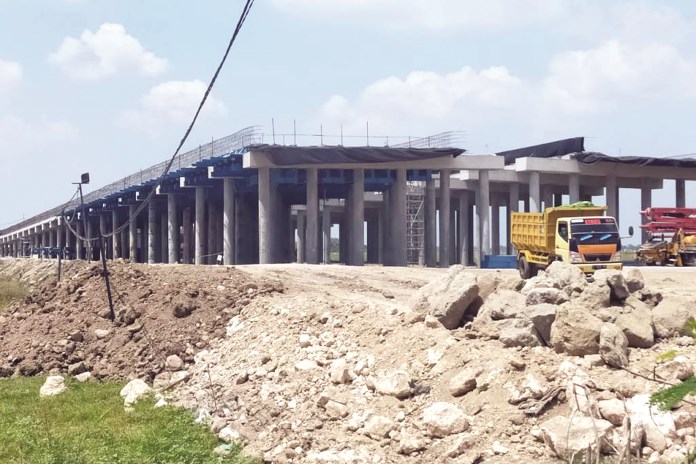 Pantauan koran ini, selain para pekerja yang berupaya menyelesaikan pembangunan jembatan, ratusan dump truk setiap hari hilir mudik terus memasok material untuk pembangunan jalan tol tersebut.