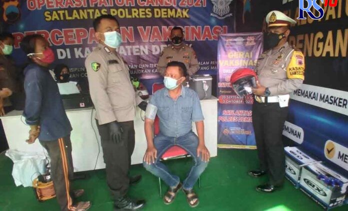 RADARSEMARANG.COM, Demak – Aksi simpatik dilaksanakan jajaran Satlantas Polres Demak. Sejumlah pengendara motor dan mobil yang terjaring dalam Operasi Patuh Candi diketahui banyak yang belum menjalani vaksinasi. Adapula yang tidak mengenakan helm saat berkendara di jalan raya.