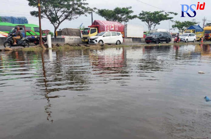 RADARSEMARANG.COM, Demak – Banjir rob yang terjadi di ruas Pantura Demak turut mengganggu proses pembangunan jalan tol Demak-Semarang. Ketinggian rob tercatat 1.3 meter. Akibatnya, air laut itu merendam sisi kanan jalan pantura Sayung. Bahkan, halaman kantor PT Wijaya Karya (Wika) juga kebanjiran rob.
