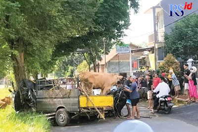 RADARSEMARANG.COM, Kajen – Sebuah pikap bermuatan lima ekor sapi kurban menabrak pohon di Jalan Raya Kutosari, Doro, Kabupaten Pekalongan, Minggu (10/7). Bagian depan mobil ringsek. Dua kernet patah tulang kaki.