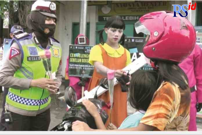 Sementara bagi pelanggar protokol kesehatan, mereka diberikan sanksi peringatan serta diberikan masker. Satlantas Polres Kendal juga menampilkan karakter dalam Film Squid Game.