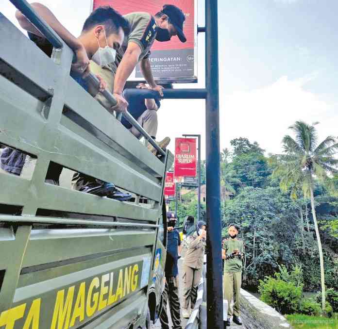 RADARSEMARANG.COM, Magelang – Satpol PP Kota Magelang membongkar tiga reklame di Daerah Canguk, Jalan Urip Sumoharjo Senin (31/5/2021). Pembongkaran dilakukan karena papan reklame belum mempunyai izin.
