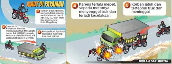 Korban Budi Apriliadi mencoba mendahului truk dari sisi kiri. Namun karena terlalu mepet, sepeda motornya menyenggol truk dan terjadi kecelakaan. Korban pun jatuh dan terlindas truk.