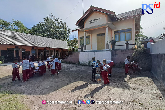 Berdasarkan pantauan Radar Magelang, nampak siswa dan siswi SDN Krinjing 2 selain ada yang belajar di kelas. Mereka juga ada yang melakukan kerja bakti membersihkan halaman sekolahnya dari abu. (rfk/bas)