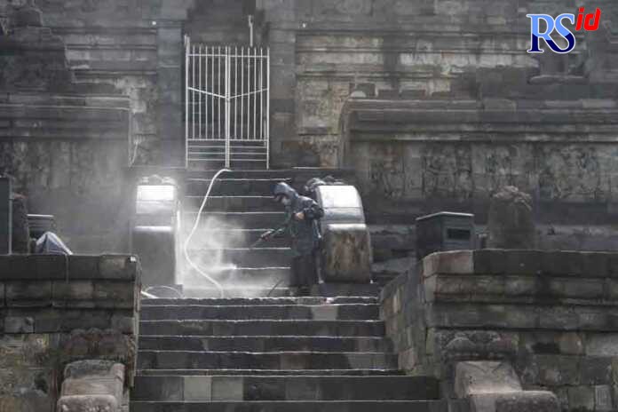 RADARSEMARANG.COM, Mungkid – Mengantisipasi tumbuhnya lumut di bebatuan Candi Borobudur, Balai Konservasi Borobudur (BKB) melakukan pembersihan di struktur bangunan candi. Terlebih di musim penghujan. Pembersihan dilakukan secara basah dan kering.