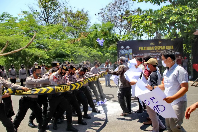 RADARSEMARANG.COM, Pekalongan – Petugas dari Polres Pekalongan Kota saling dorong dengan pengunjuk rasa, yang mendemo kantor Komisi Pemilihan Umum Kota (KPU) Pekalongan Jumat (18/9/2020). Semakin beringas, petugas akhirnya menyemprotkan air dari mobil water canon. Akhirnya massa pengunjung rasa bubar.