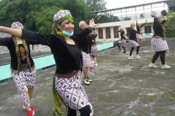 Meski melalui daring, aksi para instruktur Zumba dengan dandanan bak wayang orang lengkap kain jarik lurik khas Jawa Tengah. Para peserta mengikuti dengan antusias di tempat terpisah.