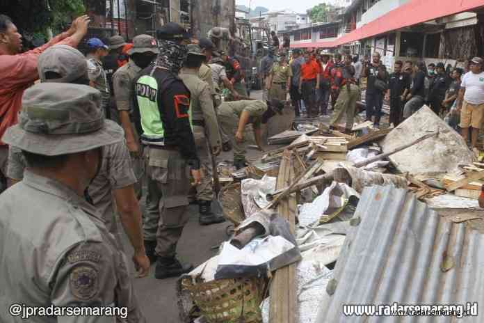 RADARSEMARANG.COM, SEMARANG – Puluhan kios dan lapak pedagang Pasar Koplak di Jalan Peterongan Tengah Raya dibongkar paksa petugas Satpol PP Kota Semarang. Sebelumnya mereka sudah diperingatkan beberapa kali untuk segera pindah ke Pasar Peterongan lantai 2 oleh Dinas Perdagangan Kota Semarang. Pembongkaran dilakukan mulai pukul 09.00. Tak ada perlawanan dari pedagang yang saat itu masih berjualan di tepi jalan tersebut.