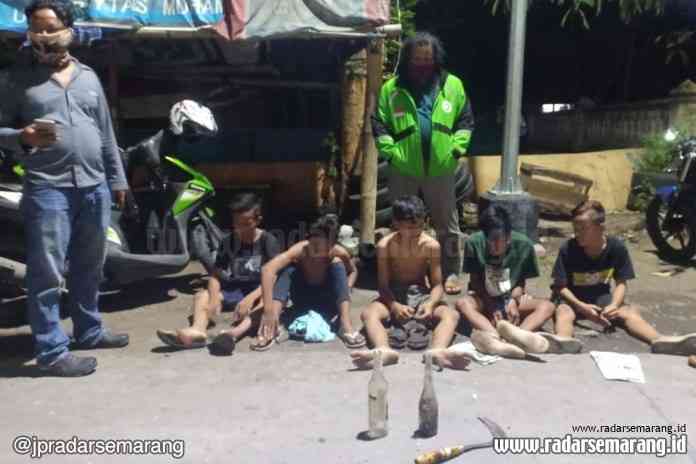 RADARSEMARANG.COM, Semarang – Sungguh ironis perbuatan yang dilakukan oleh lima bocah ini. Disaat ada larangan untuk berkumpul-kumpul, justru mereka bergerombol sembari menenggak minuman beralkohol jenis ciu dan diduga akan melakukan aksi tawuran.