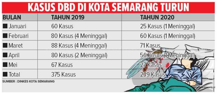 Dinas Kesehatan (Dinkes) Kota Semarang sampai Kamis (28/5/2020) pukul 10.00, mencatat ada 239 kasus DBD yang terjadi di Semarang. Tiga kasus di antaranya berakhir dengan kematian.
