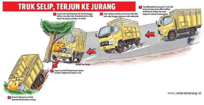 Kecelakaan tunggal ini bermula saat truk Mitsubishi bernopol H 1402 HD warna kuning yang dikemudikan korban melaju dari arah Ungaran menuju Gunungpati atau arah timur ke barat. Saat melintas di jalan menurun, tiba-tiba truk tanpa muatan itu mengalami selip hingga melaju tak terkendali. “Kebetulan jalannya licin, di lokasi sedang hujan,” kata warga sekitar, Yitno, kepada RADARSEMARANG.COM, Senin (6/7/2020).