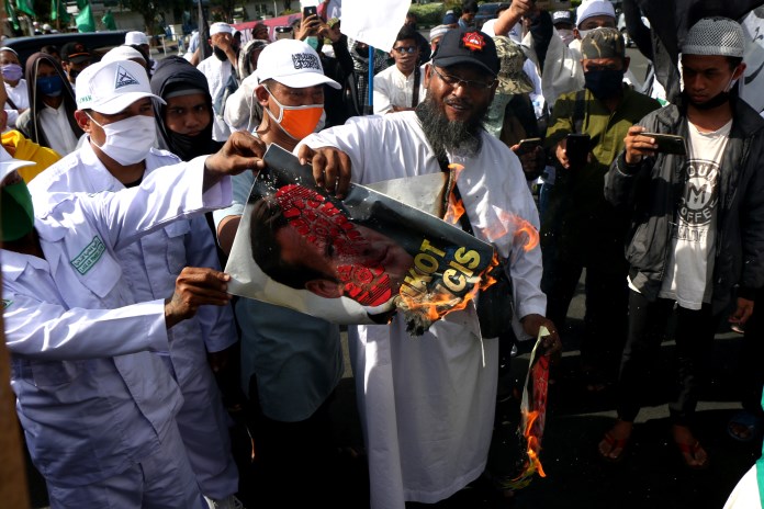 Massa mengenakan pakaian muslim dan membawa bendera ormas. Ada juga yang membawa poster besar bertuliskan ‘Mengecam Pembuat Karikatur Nabi Muhammad SAW’ dan ‘We are Ready to Die for Our Beloved Prophet’. Demo diakhiri dengan pembakaran poster. (ifa/aro/bas)