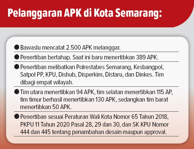 RADARSEMARANG.COM, Semarang – Bawaslu Kota Semarang telah menertibkan 389 alat peraga kampanye (APK) yang melanggar. Bawaslu masih memiliki PR mencopot 2.111 APK.