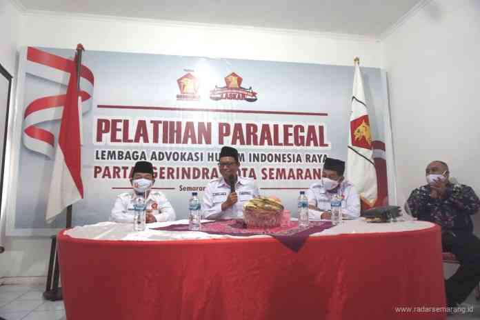 RADARSEMARANG.COM, Semarang – Dewan Pimpinan Cabang (DPC) Partai Gerindra Kota Semarang, menggelar pelatihan paralegal Lembaga Advokasi Hukum Indonesia Raya (Laskar) di aula kantor DPC Partai Gerindra Kota Semarang. Laskar merupakan sayap partai berlambang Garuda merah yang berurusan dengan bidang bantuan dan pendampingan hukum.