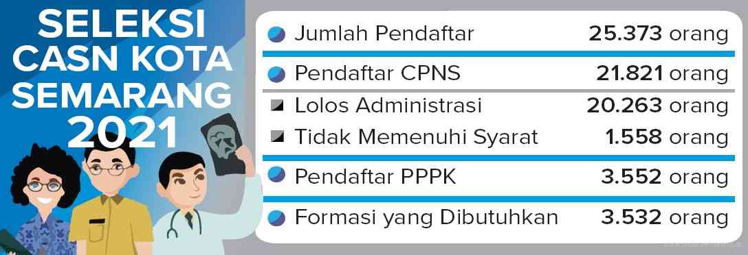 Sebelumnya pernah diberitakan, hingga penutupan pendaftaran Calon Aparatur Sipil Negara (CASN) Kota Semarang 2021 pada Senin (26/7/2021) lalu, jumlah pendaftar mencapai 25.373 orang. Rinciannya, peserta seleksi CPNS sebanyak 21.821 orang, dan PPPK sebanyak 3.552 orang. Sedangkan formasi yang dibutuhkan sebanyak 3.532 orang.