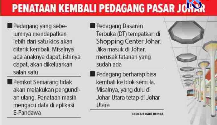 Menurut dia, penataan ulang harus dilakukan agar terhindar dari gesekan dan kesalahpahaman antarpedagang, apalagi ada pedagang Yaik Baru masuk ke Johar Utara, Tengah, ataupun Selatan. Sebaliknya, pedagang Johar masuk ke Pasar Kanjengan dan Shopping Center Johar (SCJ). “Kalau tidak dikembalikan semula akan timbul masalah ke depannya,” katanya.