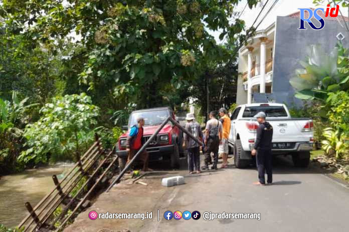 RADARSEMARANG.COM, Semarang – Hujan Lebat dan debit air saluran yang deras terjadi di Kelurahan Gunungpati, Senin (20/2) siang. Akibatnya, satu pondasi warung bakso setinggi 4 meter longsor. Termasuk satu rumah milik warga Pasarsari RT 3 RW 3 Kelurahan Gunungpati, Kecamatan Gunungpati yang berada di bawahnya juga roboh.