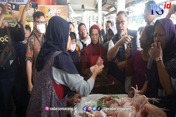 RADARSEMARANG.COM, Semarang – Menteri Perdagangan Zulkifli Hasan mengecek harga bahan pokok di Pasar Peterongan, (Minggu 9/4). Puluhan emak-emak tampak begitu antusias menyambut kedatangan Mendag yang berkeliling pasar. Sambil menyapa pedagang dan pembeli, Mendag ingin memastikan harga dan stok bahan pokok jelang Lebaran.