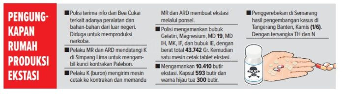 Hasilnya, polisi berhasil mengamankan dua orang berinisial MR, 28, dan ARD, 24, keduanya warga Tanjung Priok, Jakarta Utara. Perannya sebagai koki dan pencetak. Petugas juga mengamankan sejumlah barang bukti (lihat grafis).