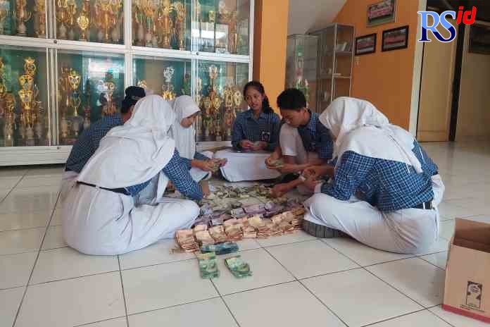 Masing-masing siswa memasukkan uang ke kotak yang telah disediakan oleh pihak sekolah sesuai dengan tingkat kelasnya agar tidak terjadi penumpukan.