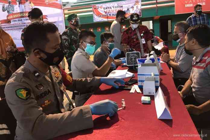 RADARSEMARANG.COM, Ungaran – Mewujudkan herd immunity (kekebalan kolektif) dari risiko penularan Covid-19, Polres Semarang menggelar vaksinasi masal. Menyasar warga di 19 kecamatan. Vaksinasi dilakukan di dua tempat yaitu di GOR Pandanaran Wujil dan gedung pertemuan kantor Kecamatan Tengaran.