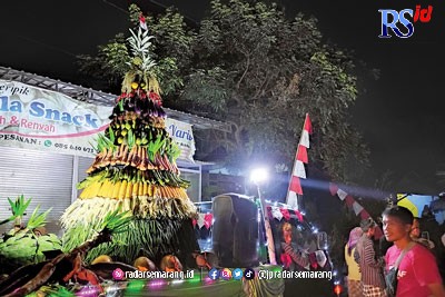 RADARSEMARANG.COM, Ungaran – Ratusan warga Merti Desa Kalongan, Kecamatan Ungaran Timur mengarak gunungan hasil bumi dalam rangka Merti Desa. Setelah diarak, hasil bumi dibagikan untuk seluruh warga serta selamatan bersama. Uniknya, kirab dilakukan malam hari.