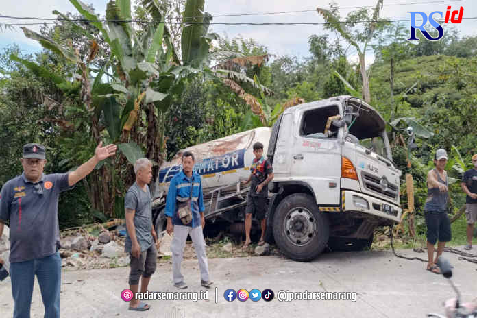 RADARSEMARANG.COM, Ungaran – Sebuah truk muatan oksigen terperosok di ruas jalan Suruh-Karanggede, Desa Medayu, Kecamatan Suruh Kamis (20/4). Diduga truk tersebut mengalami rem blong pada saat melewati turunan.