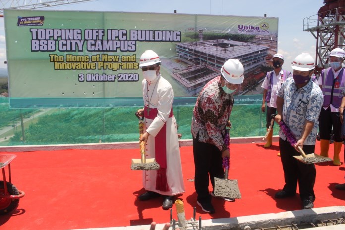 RADARSEMARANG.COM, Semarang – Ada misa konselebrasi di acara topping-off gedung IPC kampus BSB City. Prosesi itu bersamaan setengah jadinya gedung Unika Soegijapranata Semarang di Mijen Senin (5/10/2020). Pembangunan gedung IPC itu diprediksi selesai Februari 2021. Uskup Agung Semarang Mgr Robertus Rubiyatmoko Pr dan Pastor Kepala Campus Ministry Unika Soegijapranata Romo Aloysius Budi Purnomo Pr hadir sebagai konselebran.