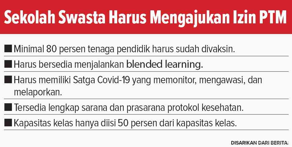 Sementara itu, sekolah yang ingin mengajukan PTM, kata Gunawan, harus memenuhi syarat 80 persen guru dan tenaga kependidikan (tendik) sudah mendapatkan vaksinasi. Selain itu, terkait sarana dan prasarana prokes harus memadahi di antaranya tempat cuci tangan, alat cek suhu tubuh, dan pengaturan jaga jarak di setiap kelas. “Kalau kapasitasnya sama, 50 persen dari siswa per kelas. Intinya sarpras harus siap,” tambahnya.