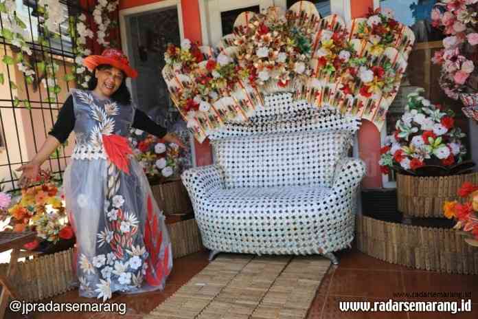 ”Ini kami kerjakan selama kurang lebih dua bulan,” ujar perempuan yang mengkhususkan sofa yang dibuatnya ini untuk Gubernur Ganjar Pranowo pada gelaran Kongres Sampah belum lama ini.