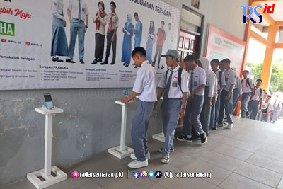 Pagi itu, para siswa berbaris rapi di pintu masuk SMK Bhumi Phala Parakan, Temanggung. Mereka antre melakukan presensi di empat handphone yang diletakkan di atas meja satu kaki warna putih setinggi 75 cm. Satu per satu mereka melakukan input E-presensi yang bernama aplikasi Mipha Smart Book itu dengan kartu pelajar yang sudah dilengkapi barcode.