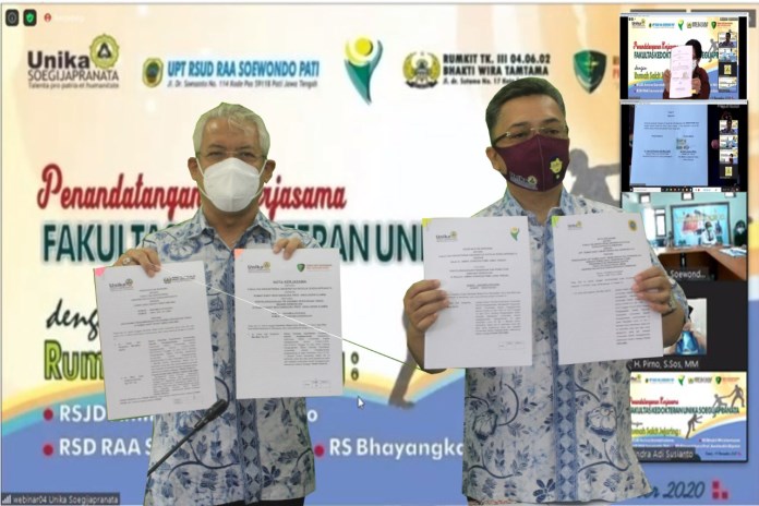 RADARSEMARANG.COM, Semarang – Fakultas Kedokteran Unika Soegijapranata menandatangani nota kesepahaman dengan empat rumah sakit di Jawa Tengah. Kerjasama ini untuk mewujudkan akselerasi kurikulum dengan kebijakan Merdeka Belajar-Kampus Merdeka. Keempat rumah sakit tersebut adalah RSUD RAA Soewondo Pati, RSJD Dr Amino Gondohutomo Semarang, Rumah Sakit Bhakti Wira Tamtama Semarang dan Rumah Sakit Bhayangkara Prof Awaloedin Djamin Semarang.
