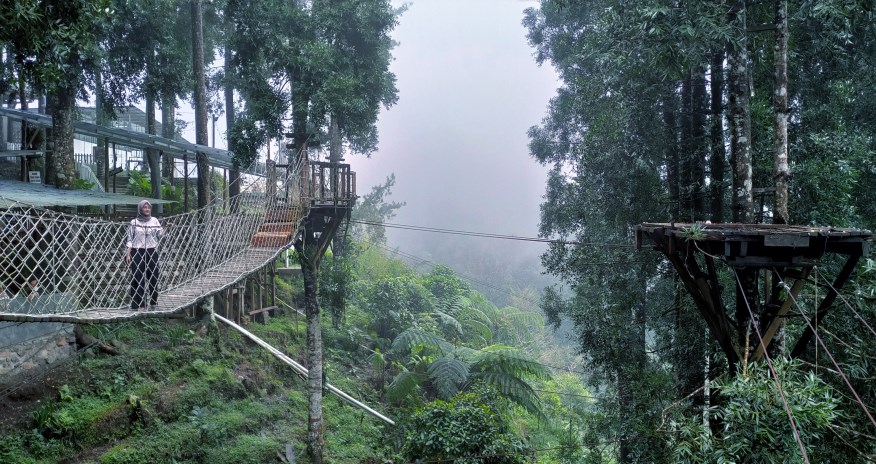Cukup disayangkan, saat musim hujan, spot jaring-jaring tidak boleh dilewati. Demi faktor keselamatan. RADARSEMARANG.COM pun akhirnya melalui jembatan gantung. Perlu menaiki 15 anak tangga untuk sampai di atas pohon pinus. Lokasinya berada di atas lembah. Sama dengan konsep wisata outbound. Bedanya, akses itu tidak membuat mati gaya.