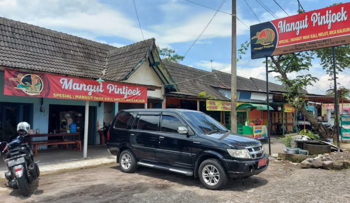Keunikan penyajian mangut iwak kali ini bisa ditemui di warung makan Mangut Pintjoek. Lokasinya berada di jalan Raya Blabak-Ketep Pass, Dusun Jetis, Kecamatan Mungkid, Kabupaten Magelang. Di depan warung, pengunjung bisa melihat hamparan sawah yang luas, nan hijau.