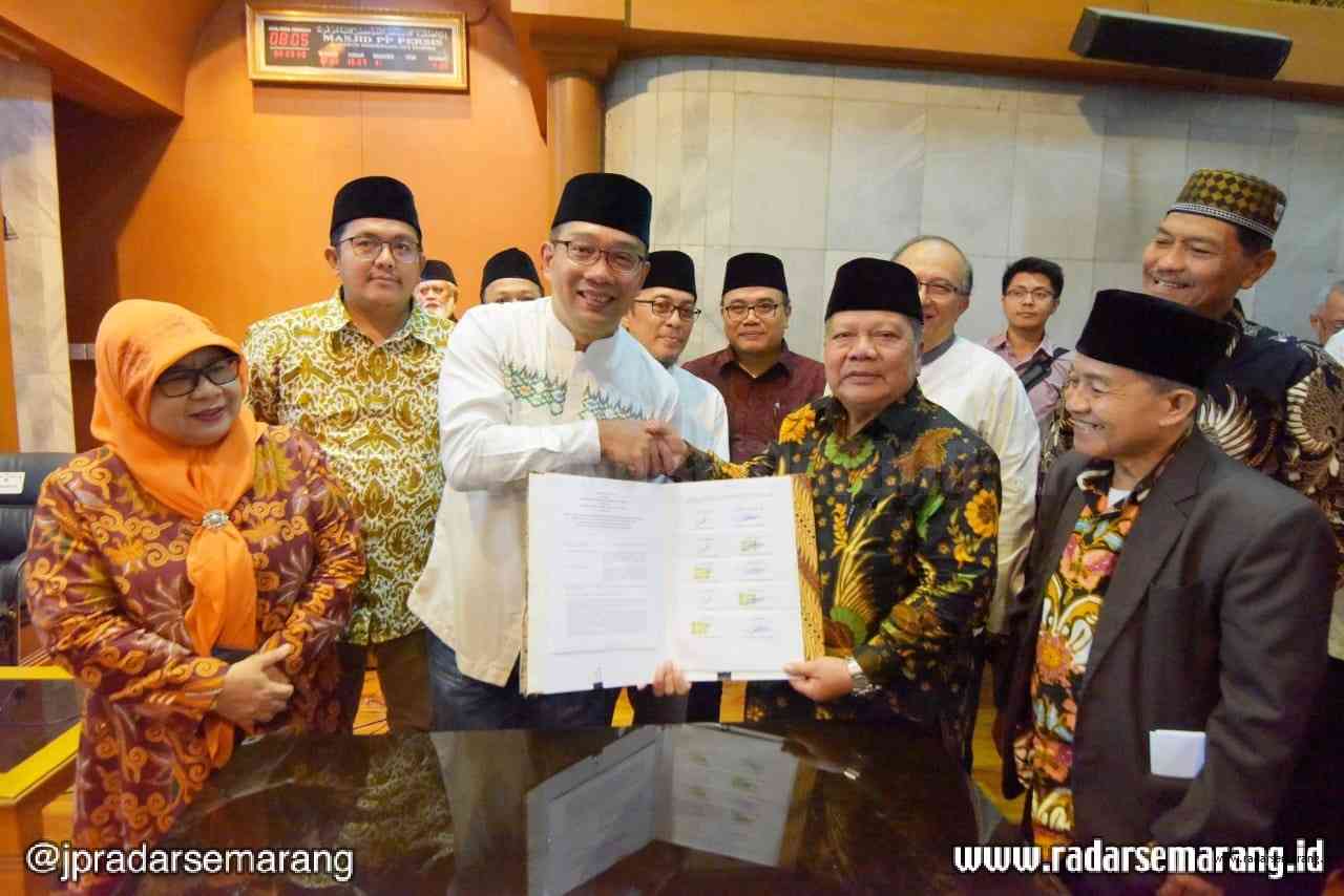 Gubernur Ridwan Kamil bersama Ketua Umum PP Persis KH Aceng Zakaria menandatangani naskah Perjanjian Hibah disaksikan ribuan jemaah Pengajian Rutin Ahad, di Masjid PP Persis, Kota Bandung, Minggu (8/3/2020),