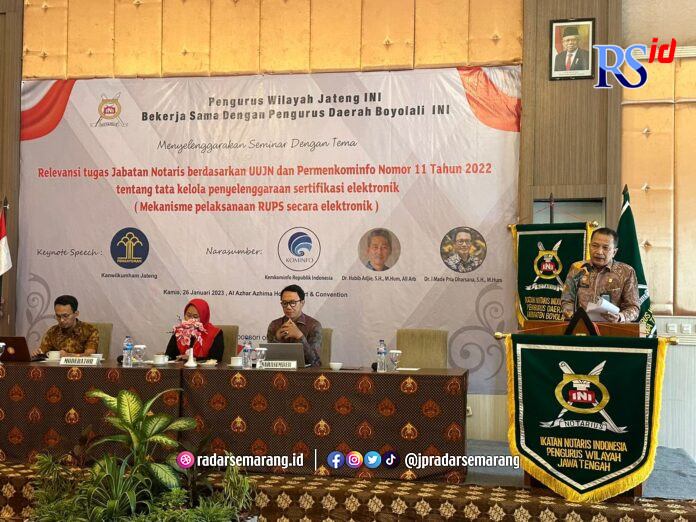 RADARSEMARANG.COM, Boyolali – Kepala Divisi Pelayanan Hukum dan HAM Kanwil Kemenkumham Jateng, Nur Ichwan menegaskan notaris memiliki kewenangan dan kewajiban yang harus laksanakan dengan baik. Hal itu disampaikan saat menjadi Keynote Speech pada Kegiatan Seminar Kenotariatan, Kamis (26/1).